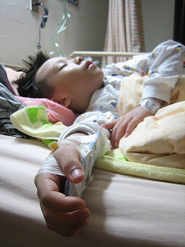 16日在病房繼續發燒-退燒循環,前夜睡覺時煩躁亂踢亂扯,把上面照片中的滴扯掉了,所以一大早重打(IV-3A),順便驗血,因為正在睡覺兼發燒中被叫醒,所以小隴嚴重超級不爽,以拳打腳踢抗拒,在我以類似摔角的十字固定技壓制下,第一針仍然以失敗收場,最後在被吵醒的隴媽技術支援(隴媽也算專業人士)加好言相勸下,在左晼上貼上了3號貼紙(第3針,IV-3B 3A失敗不算)。